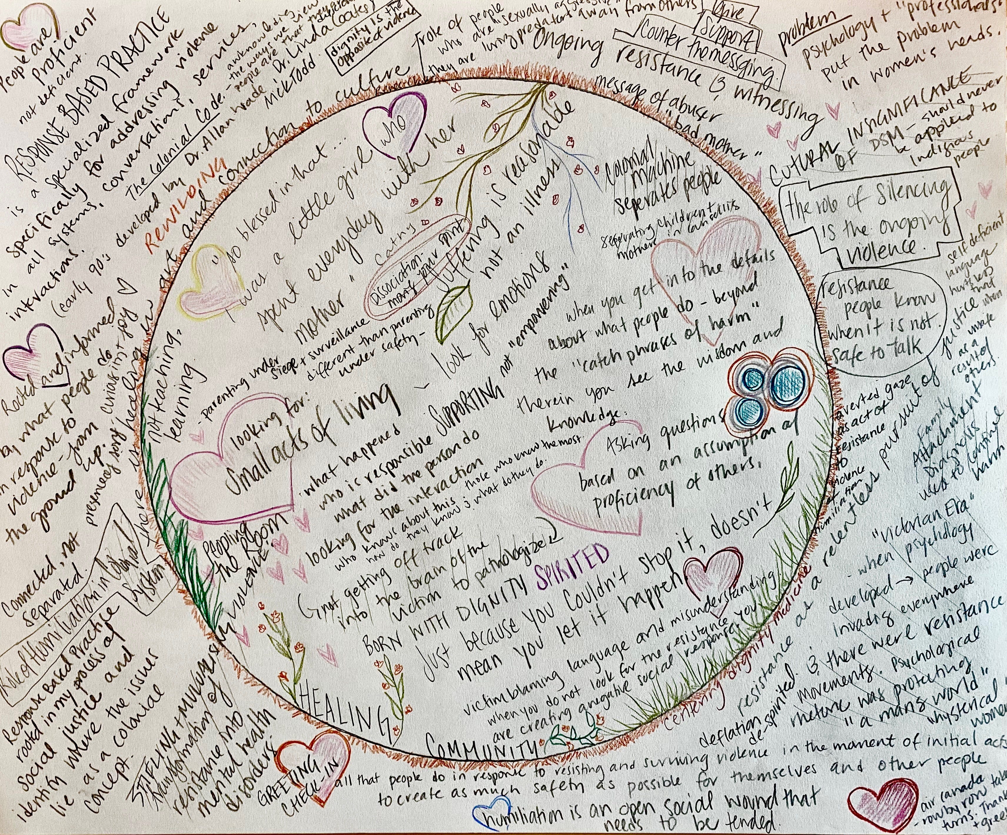 “What I’ve learnt from this event is that response-based practice is about remaining curious and teachable. What can we learn from the people we support and walk alongside? This is not about ‘advice giving’, it’s not about ‘diagnoses’, and it’s not about ‘empowering’ victims. It’s about guiding each other to remember and recognize the wisdom and resilience~resistance~power that already lives within each of us, including our ancestral wisdom! How can we support and walk alongside each other, to honour our Spirits? To come even more fully ALIVE? How can we remember more often that we are powerful co-creators of our collective future, that we have the power to heal ourselves and each other? To remember and recognize, even while we experience some of the most painful harmful moments of our lives, we are engaging in Small Acts of Living that protect ourselves and those around us, we still use whatever power is available to us. We can restore dignity for each other by supporting ‘the injured party in pursuing just redress. Dignity is expressed in the insatiable desire for self-governance, in a context of freedom and equality.’ (Richardson & Wade, 2010, p. 138).”